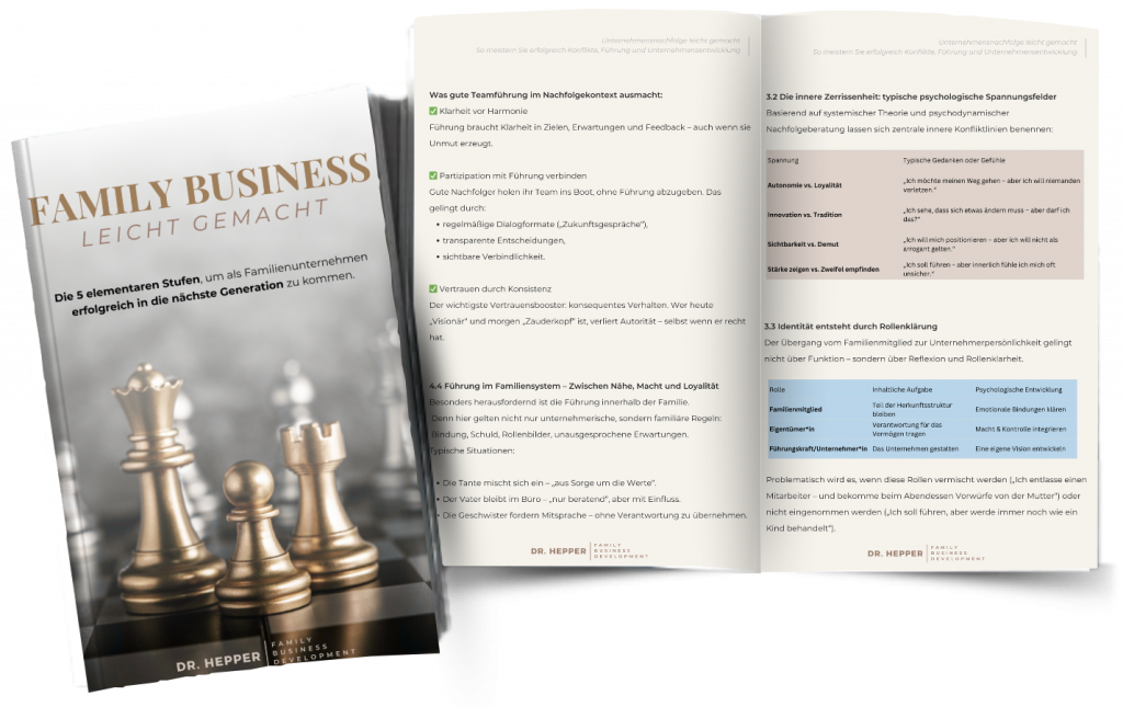 Unausgesprochene Erwartungen, verletzte Egos, alte Geschichten: Familienkonflikte werden schnell zum Risikofaktor für das ganze Unternehmen. Sie lernen im E-Paper, Spannungen anzusprechen und konstruktiv zu lösen – für mehr Vertrauen und Freude an der Zusammenarbeit